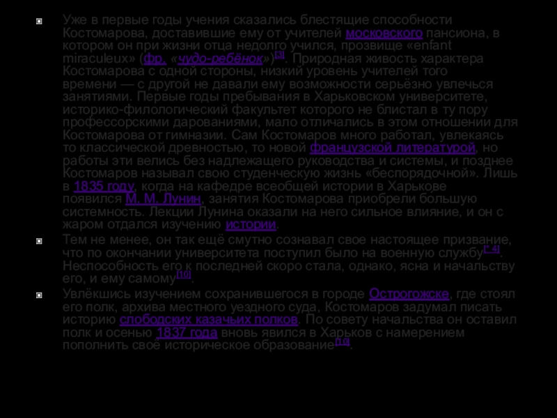 от учителей московского пансиона, в котором он при жизни отца недолго учился, прозвище «enfant miraculeux» (фр. «чудо-ребёнок»)[3]. Природная живость характера Костомарова с одной стороны, низкий уровень учителей того времени — с другой не давали ему возможности серьёзно увлечься занятиями. Первые годы пребывания в Харьковском университете, историко-филологический факультет которого не блистал в ту пору профессорскими дарованиями, мало отличались в этом отношении для Костомарова от гимназии. Сам Костомаров много работал, увлекаясь то классической древностью, то новой французской литературой, но работы эти велись без надлежащего руководства и системы, и позднее Костомаров называл свою студенческую жизнь «беспорядочной». Лишь в 1835 году, когда на кафедре всеобщей истории в Харькове появился М. М. Лунин, занятия Костомарова приобрели бо́льшую системность. Лекции Лунина оказали на него сильное влияние, и он с жаром отдался изучению истории.