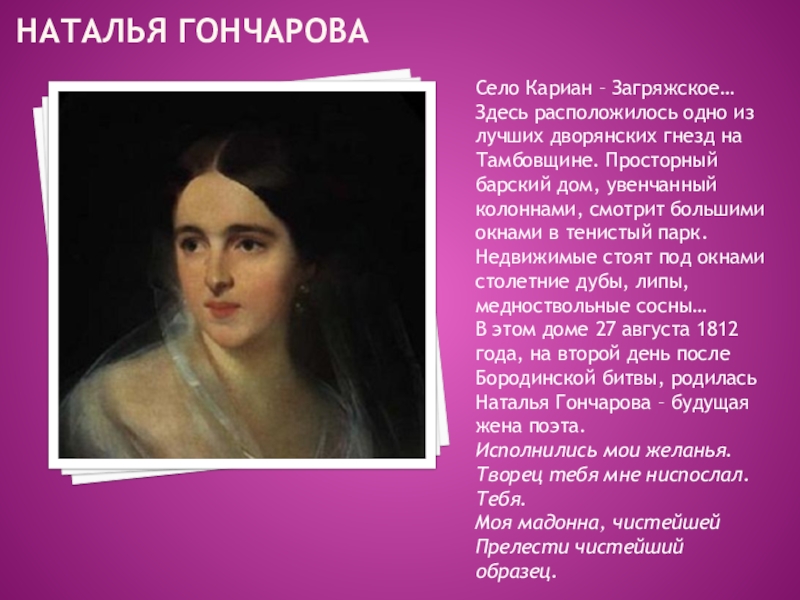 В этом доме 27 августа 1812 года, на второй день после Бородинской битвы, родилась Наталья Гончарова – будущая жена поэта.