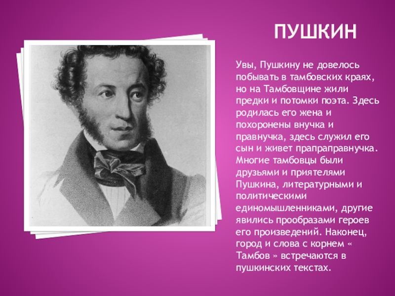 жили предки и потомки поэта. Здесь родилась его жена и похоронены внучка и правнучка, здесь служил его сын и живет прапраправнучка. Многие тамбовцы были друзьями и приятелями Пушкина, литературными и политическими единомышленниками, другие явились прообразами героев его произведений. Наконец, город и слова с корнем « Тамбов » встречаются в пушкинских текстах.