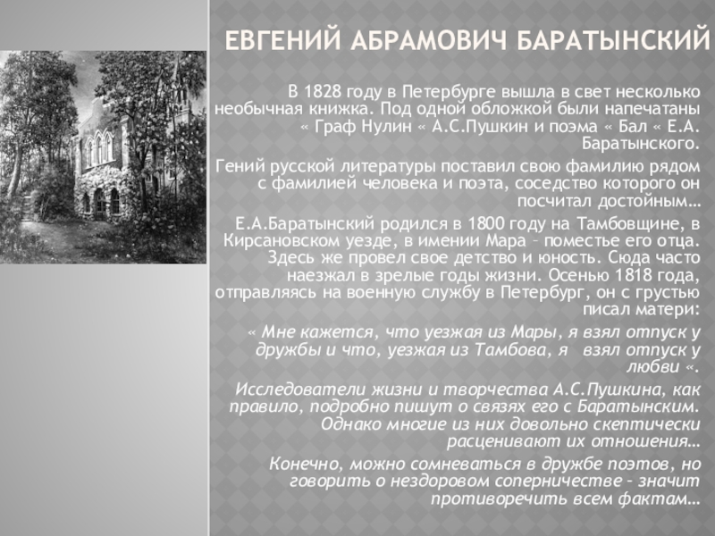Е.А.Баратынский родился в 1800 году на Тамбовщине, в Кирсановском уезде, в имении Мара – поместье его отца. Здесь же провел свое детство и юность. Сюда часто наезжал в зрелые годы жизни. Осенью 1818 года, отправляясь на военную службу в Петербург, он с грустью писал матери: