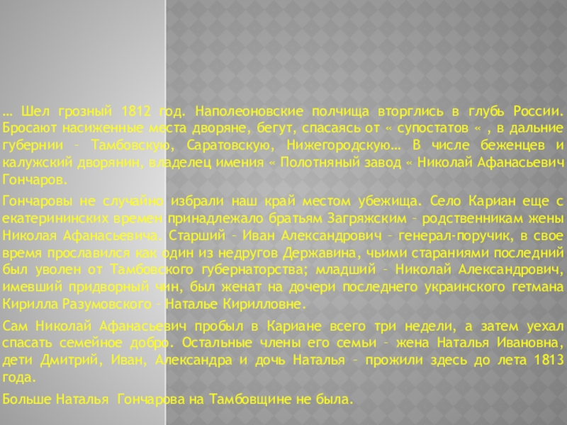 Гончаровы не случайно избрали наш край местом убежища. Село Кариан еще с екатерининских времен принадлежало братьям Загряжским – родственникам жены Николая Афанасьевича. Старший – Иван Александрович – генерал-поручик, в свое время прославился как один из недругов Державина, чьими стараниями последний был уволен от Тамбовского губернаторства; младший – Николай Александрович, имевший придворный чин, был женат на дочери последнего украинского гетмана Кирилла Разумовского – Наталье Кирилловне.