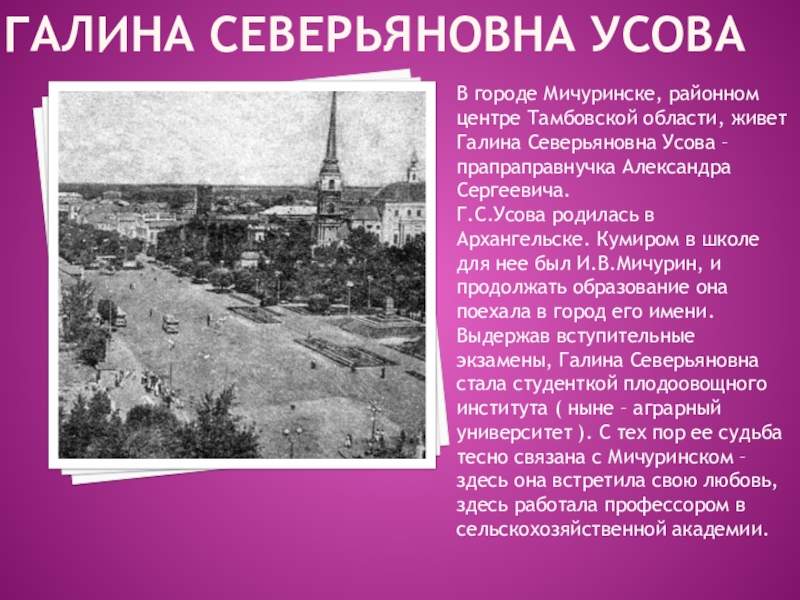 Г.С.Усова родилась в Архангельске. Кумиром в школе для нее был И.В.Мичурин, и продолжать образование она поехала в город его имени. Выдержав вступительные экзамены, Галина Северьяновна стала студенткой плодоовощного института ( ныне – аграрный университет ). С тех пор ее судьба тесно связана с Мичуринском – здесь она встретила свою любовь, здесь работала профессором в сельскохозяйственной академии.
