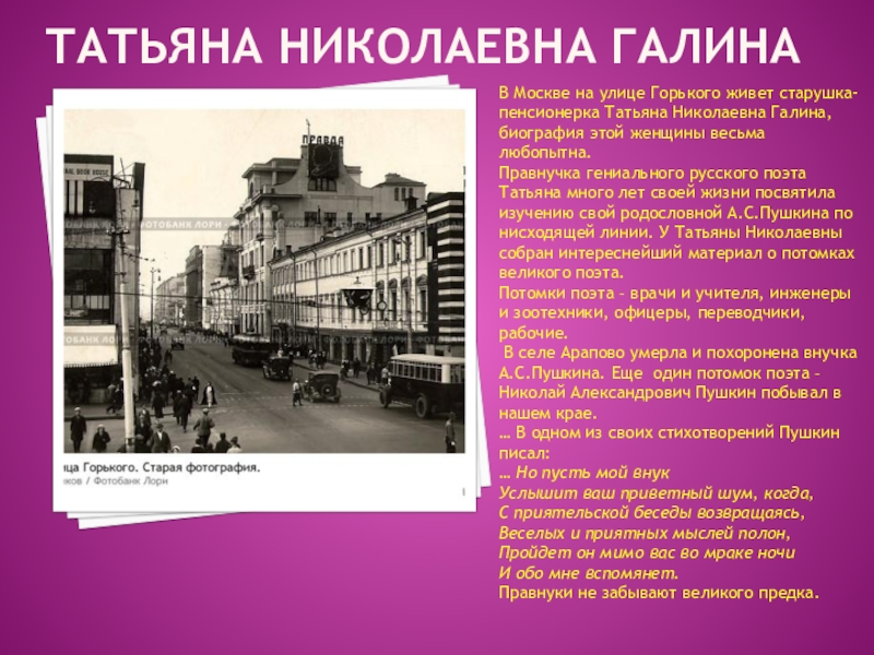 В Москве на улице Горького живет старушка- пенсионерка Татьяна