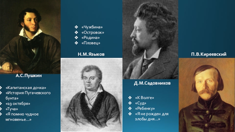 А.С.ПушкинН.М.ЯзыковД.М.СадовниковП.В.Киреевский«Капитанская дочка»«История Пугачевского бунта»«19 октября»«Туча»«Я помню чудное мгновенье…» «Чужбина»«Островок»«Родина»«Пловец»«К Волге»«Суд»«Ребенку»«Я не рожден для злобы дня…»