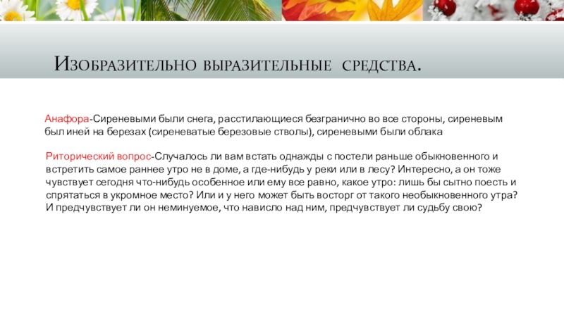 Риторический вопрос-Случалось ли вам встать однажды с постели раньше обыкновенного и встретить самое раннее утро не в доме, а где-нибудь у реки или в лесу? Интересно, а он тоже чувствует сегодня что-нибудь особенное или ему все равно, какое утро: лишь бы сытно поесть и спрятаться в укромное место? Или и у него может быть восторг от такого необыкновенного утра? И предчувствует ли он неминуемое, что нависло над ним, предчувствует ли судьбу свою?