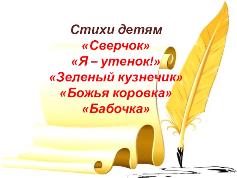 Слайд 4Стихи детям «Сверчок» «Я – утенок!» «Зеленый кузнечик» «Божья коровка» «Бабочка»