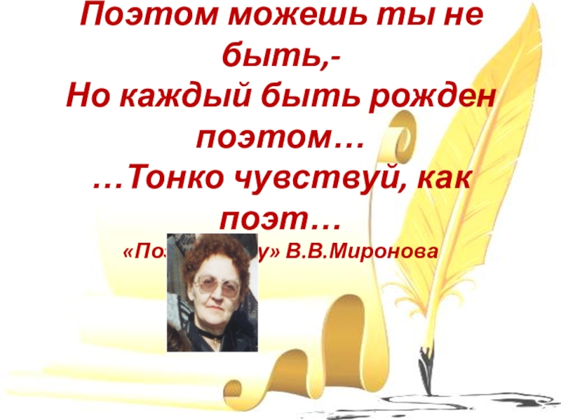 Поэтом можешь ты не быть,- Но каждый быть рожден поэтом… …Тонко чувствуй, как поэт… «Поэт поэту» В.В.Миронова
