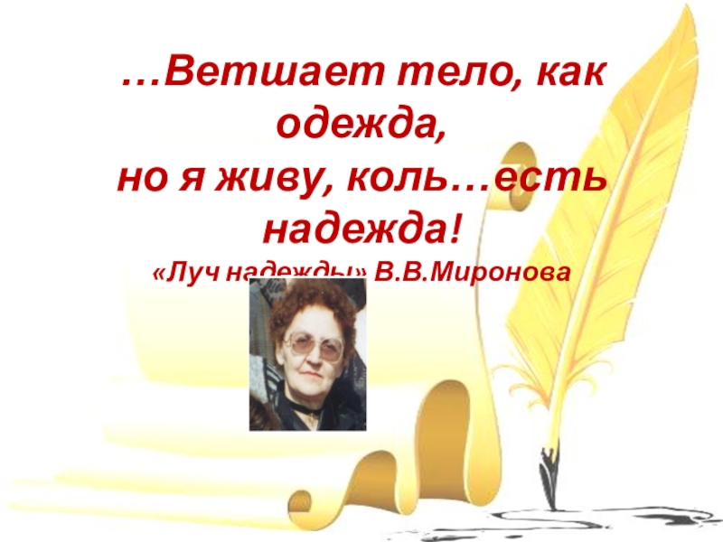 Слайд 6…Ветшает тело, как одежда, но я живу, коль…есть надежда! «Луч надежды» В.В.Миронова