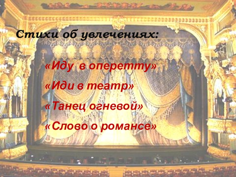 Стихи об увлечениях:«Иду в оперетту»«Иди в театр»«Танец огневой»«Слово о романсе»