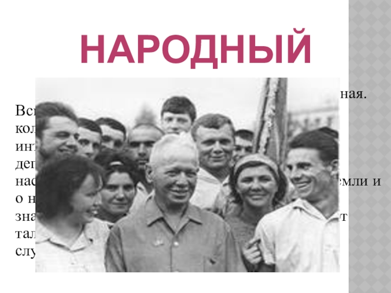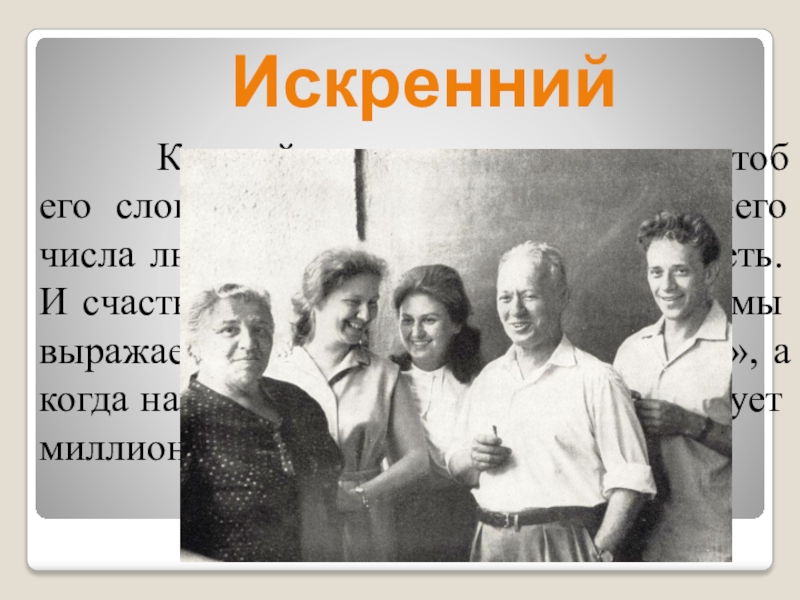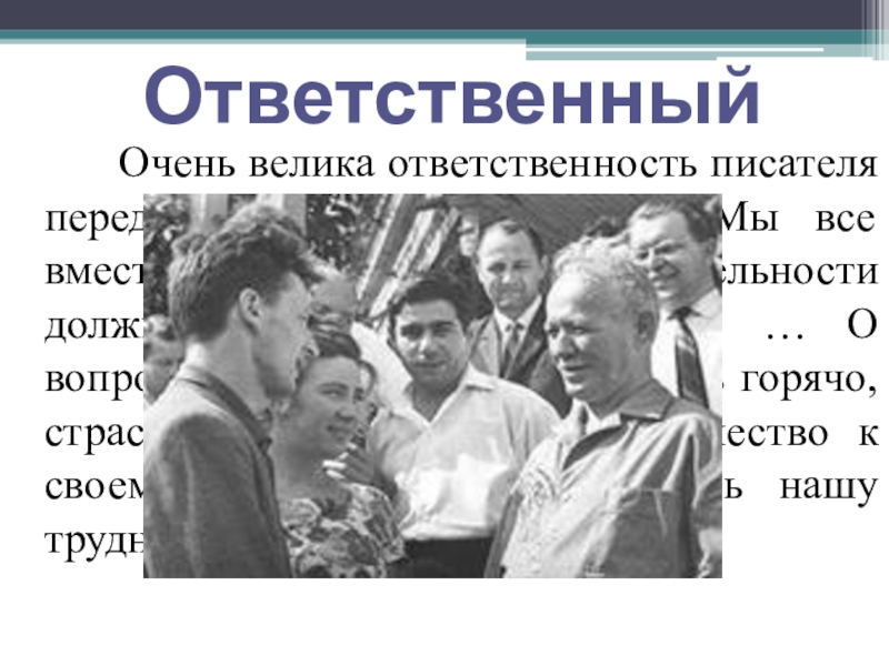 народом, очень велика. Мы все вместе и каждый из нас по отдельности должны быть совестью народа. … О вопросах творчества надо говорить горячо, страстно. Надо приблизить творчество к своему сердцу и горячо любить нашу трудную профессию.