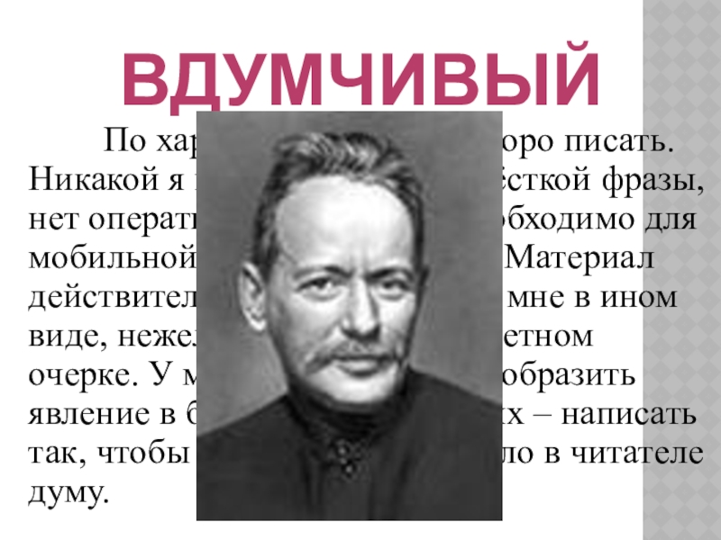 скоро писать. Никакой я не газетчик. Нет хлёсткой фразы, нет оперативности, что так необходимо для мобильной газетной работы… Материал действительно представляется мне в ином виде, нежели это принято в газетном очерке. У меня потребность изобразить явление в более широких связях – написать так, чтобы рассказанное вызвало в читателе думу.
