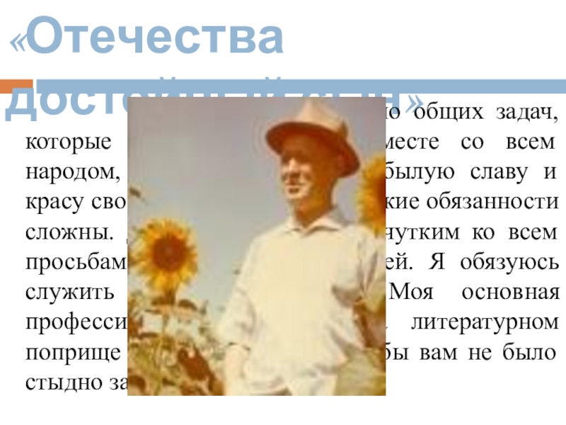 общих задач, которые мы будем решать вместе со всем народом, предстоит возродить былую славу и красу своего народа. … Депутатские обязанности сложны. Депутат должен быть чутким ко всем просьбам и жалобам избирателей. Я обязуюсь служить вашим интересам. Моя основная профессия – писатель. Я на литературном поприще буду работать так, чтобы вам не было стыдно за меня.