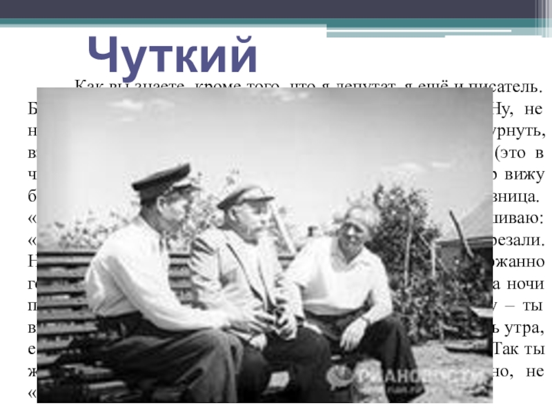 что я депутат, я ещё и писатель. Бывает так: что-то не даётся глава, бессонная ночь. Ну, не нравится то, что написал. Понимаете, надо выйти, курнуть, взглянуть на Дон, подумать о чём-то. Не успел выйти (это в четыре часа утра, летом, до восхода солнца), через забор вижу бричку, распряжённую пару быков… Идёт казачка-колхозница. «Я, - говорит, - к тебе с нуждой, к депутату». Спрашиваю: «Какая нужда?» Выяснилось, что шесть соток огорода отрезали. Неправильно отрезали. Но дело не в этом. Тихо, сдержанно говорю: «Что ты, милая, в четыре утра? Ты бы в два часа ночи пришла». Она говорит: «Так я ж тебя не будила. Я вижу – ты вышел…» Спрашиваю: « Ты в райисполком пойдёшь в семь утра, если там с девяти начинается работа?» А она говорит: « Так ты ж не учреждение». Что тут можно возразить? Конечно, не «учреждение». Ну, давай, говори свою нужду…