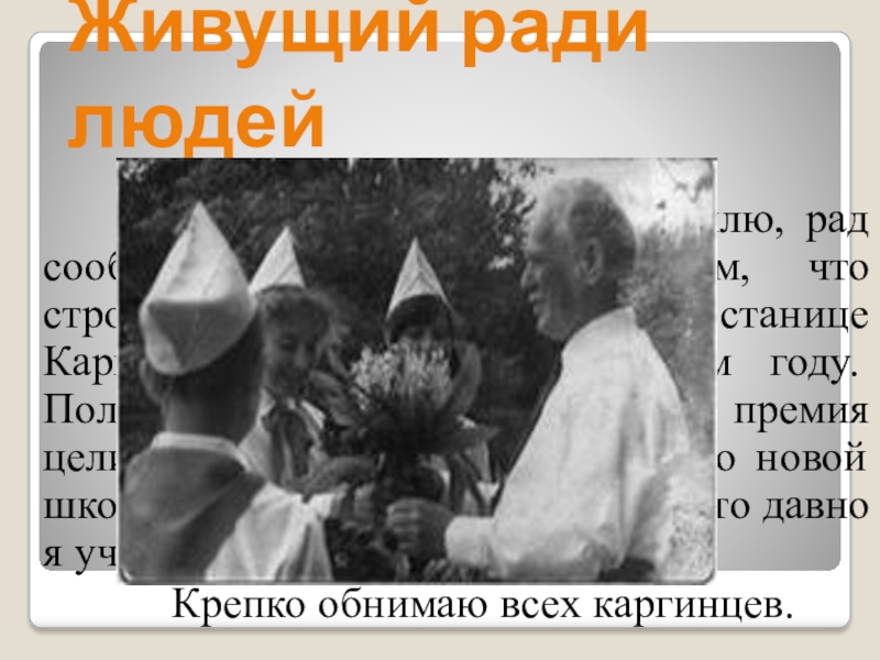землю, рад сообщить дорогим станичникам, что строительство новой школы в станице Каргинской … начнётся в этом году. Полученная мною Ленинская премия целиком передана на строительство новой школы взамен той, в которой когда-то давно я учился грамоте.