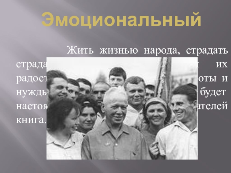 Жить жизнью народа, страдать страданиями людей, радоваться их радостями, целиком войти в их заботы и нужды – вот тогда у писателя будет настоящая, волнующая сердца читателей книга.