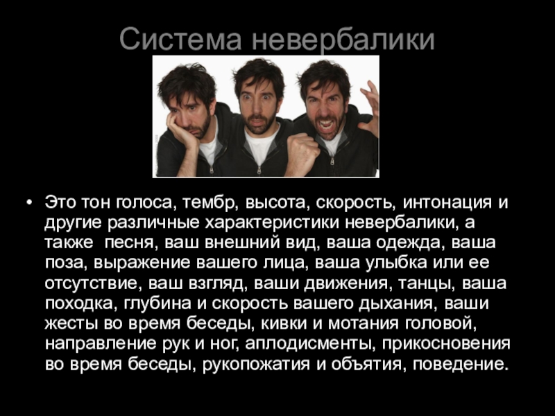 характеристики невербалики, а также песня, ваш внешний вид, ваша одежда, ваша поза, выражение вашего лица, ваша улыбка или ее отсутствие, ваш взгляд, ваши движения, танцы, ваша походка, глубина и скорость вашего дыхания, ваши жесты во время беседы, кивки и мотания головой, направление рук и ног, аплодисменты, прикосновения во время беседы, рукопожатия и объятия, поведение.