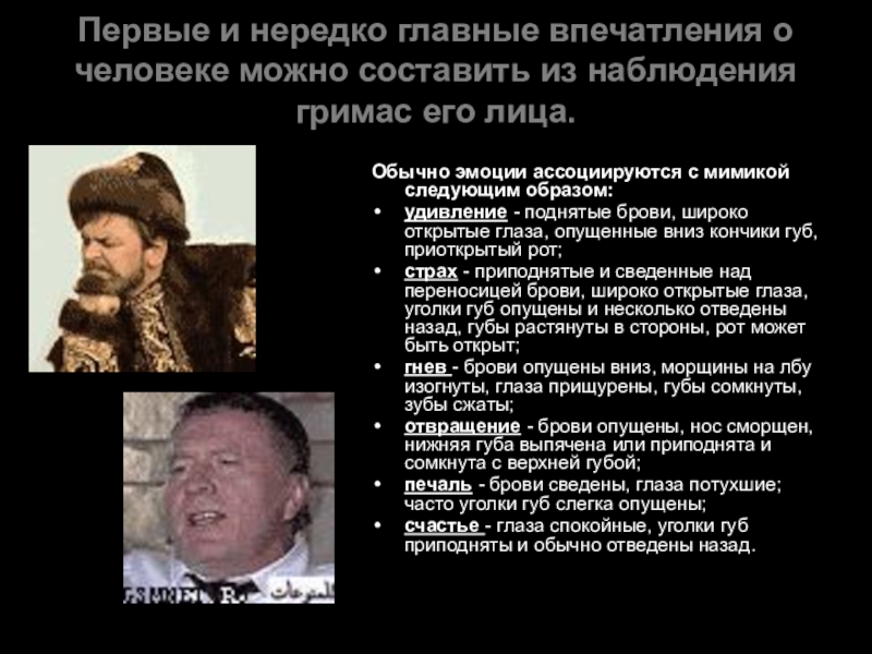 гнев - брови опущены вниз, морщины на лбу изогнуты, глаза прищурены, губы сомкнуты, зубы сжаты;