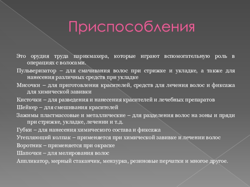 Дайте определения инструментам и приспособлениям парикмахера. В Чем