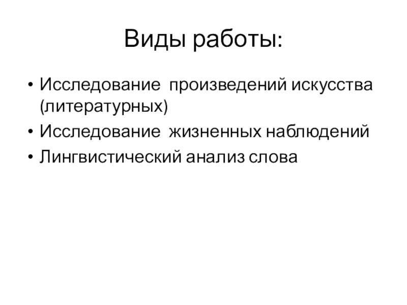 Виды работы:Исследование произведений искусства (литературных)Исследование жизненных наблюденийЛингвистический анализ слова