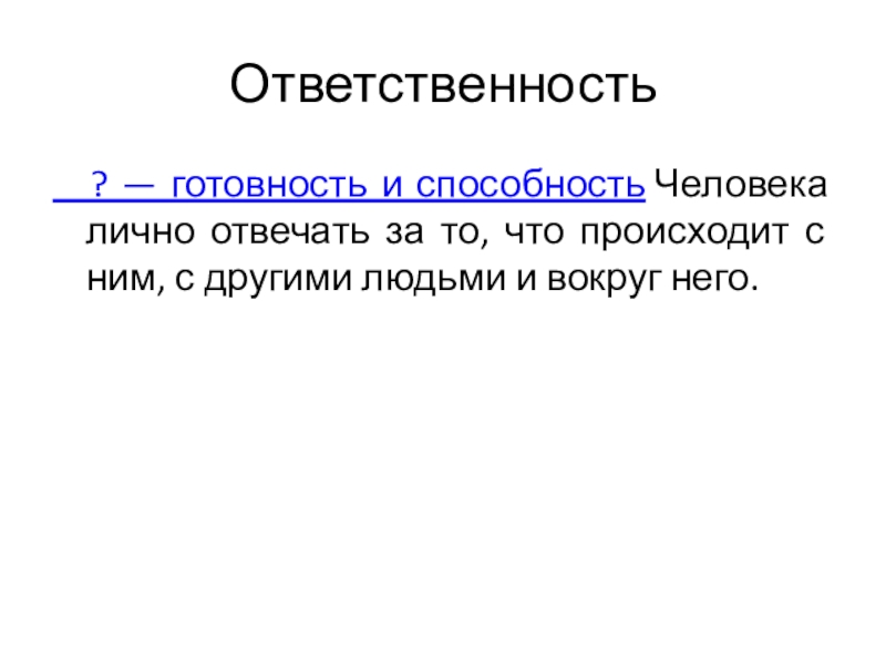 Ответственность  ? — готовность и способность Человека лично отвечать за то, что происходит с ним, с другими