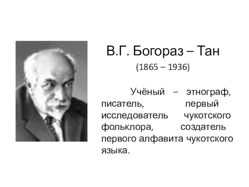 В.Г. Богораз – Тан(1865 – 1936)    Учёный – этнограф, писатель, первый исследователь чукотского фольклора,