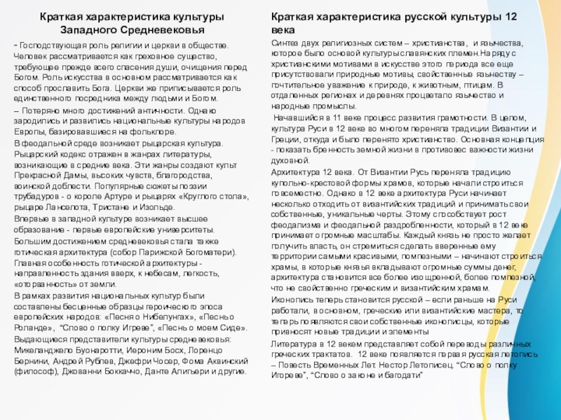 Начавшийся в 11 веке процесс развития грамотности. В целом, культура Руси в 12 веке во многом переняла традиции Византии и Греции, откуда и было перенято христианство. Основная концепция - показать бренность земной жизни в противовес важности жизни духовной.