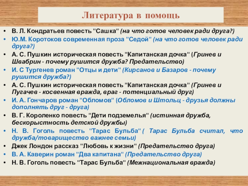поможет мой читательский опыт. Ведь во многих произведениях мы находим описание и теплоты человеческих отношений, и неприязни людей. Художники слова также рисуют нам примеры, когда дружба перерастает во вражду или наоборот, показывают героев, способных или не способных ценить дружбу, умеющих преодолевать конфликты или сеющих вражду.