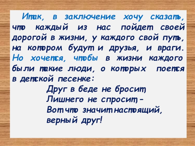 дорогой в жизни, у каждого свой путь, на котором будут и друзья, и враги. Но хочется, чтобы в жизни каждого были такие люди, о которых поется в детской песенке: