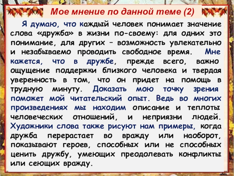 по-своему: для одних это понимание, для других – возможность увлекательно и незабываемо проводить свободное время. Мне кажется, что в дружбе, прежде всего, важно ощущение поддержки близкого человека и твердая уверенность в том, что он придет на помощь в трудную минуту. Доказать мою точку зрения поможет мой читательский опыт. Ведь во многих произведениях мы находим описание и теплоты человеческих отношений, и неприязни людей. Художники слова также рисуют нам примеры, когда дружба перерастает во вражду или наоборот, показывают героев, способных или не способных ценить дружбу, умеющих преодолевать конфликты или сеющих вражду.