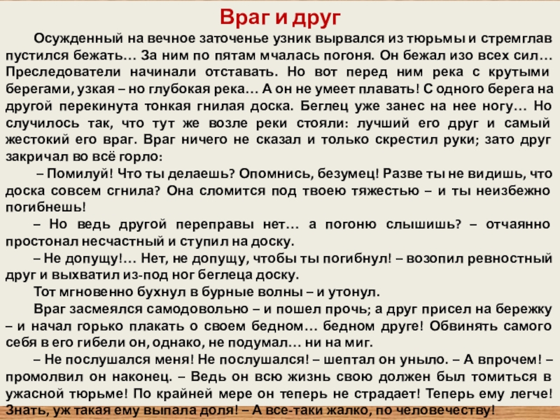 и стремглав пустился бежать… За ним по пятам мчалась погоня. Он бежал изо всех сил… Преследователи начинали отставать. Но вот перед ним река с крутыми берегами, узкая – но глубокая река… А он не умеет плавать! С одного берега на другой перекинута тонкая гнилая доска. Беглец уже занес на нее ногу… Но случилось так, что тут же возле реки стояли: лучший его друг и самый жестокий его враг. Враг ничего не сказал и только скрестил руки; зато друг закричал во всё горло: