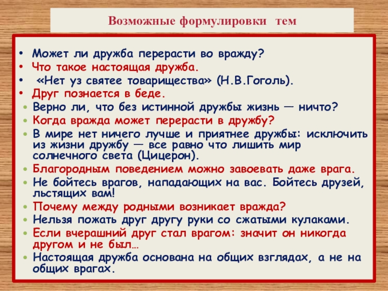Это постоянные спутники как отдельно взятого человека, так и общества в целом. Так, в жизни каждого из нас есть люди, которых мы с уверенностью можем назвать друзьями. Это те, которым мы полностью доверяем, отношения с которыми основаны на искренности, взаимных симпатиях, общих интересах и увлечениях. Но жизнь многогранна и полярна, поэтому она ставит перед нами и ряд испытаний, и к таким можно отнести понятия вражды, неприязни, ненависти, нелюбви. В своем сочинении мне хочется поразмышлять над темой (высказыванием ФИО, ответить на актуальный во все времена вопрос)….