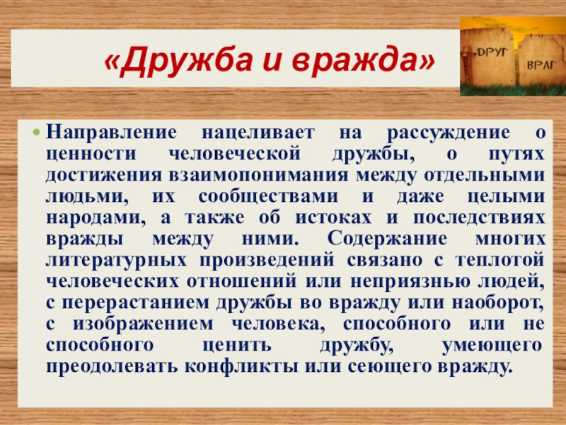 о путях достижения взаимопонимания между отдельными людьми, их сообществами и даже целыми народами, а также об истоках и последствиях вражды между ними. Содержание многих литературных произведений связано с теплотой человеческих отношений или неприязнью людей, с перерастанием дружбы во вражду или наоборот, с изображением человека, способного или не способного ценить дружбу, умеющего преодолевать конфликты или сеющего вражду.