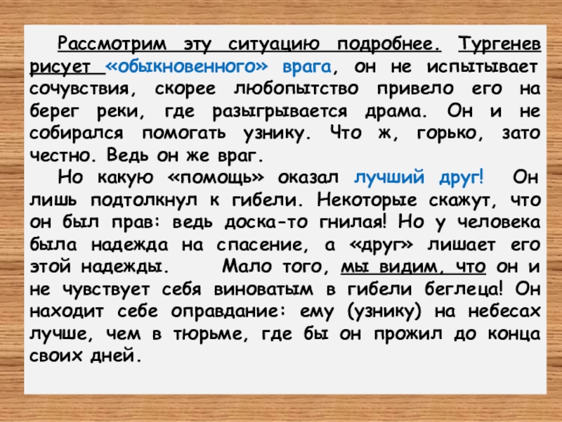 Но какую «помощь» оказал лучший друг! Он лишь подтолкнул к гибели. Некоторые скажут, что он был прав: ведь доска-то гнилая! Но у человека была надежда на спасение, а «друг» лишает его этой надежды. Мало того, мы видим, что он и не чувствует себя виноватым в гибели беглеца! Он находит себе оправдание: ему (узнику) на небесах лучше, чем в тюрьме, где бы он прожил до конца своих дней.
