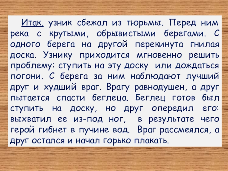берегами. С одного берега на другой перекинута гнилая доска. Узнику приходится мгновенно решить проблему: ступить на эту доску или дождаться погони. С берега за ним наблюдают лучший друг и худший враг. Врагу равнодушен, а друг пытается спасти беглеца. Беглец готов был ступить на доску, но друг опередил его: выхватил ее из-под ног, в результате чего герой гибнет в пучине вод. Враг рассмеялся, а друг остался и начал горько плакать.