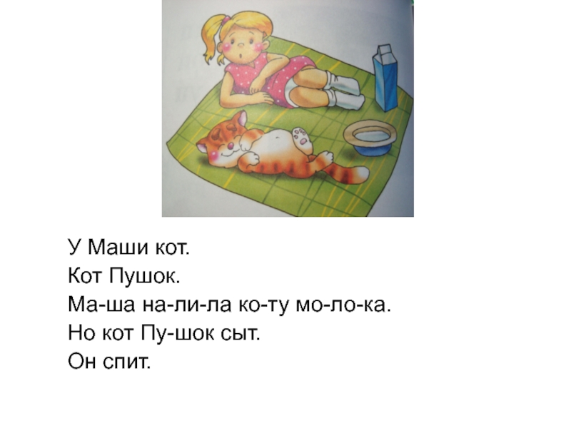 У Маши кот. Кот Пушок. Ма-ша на-ли-ла ко-ту мо-ло-ка.Но кот Пу-шок сыт.Он спит.