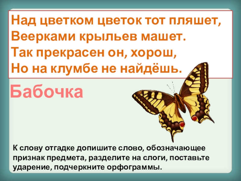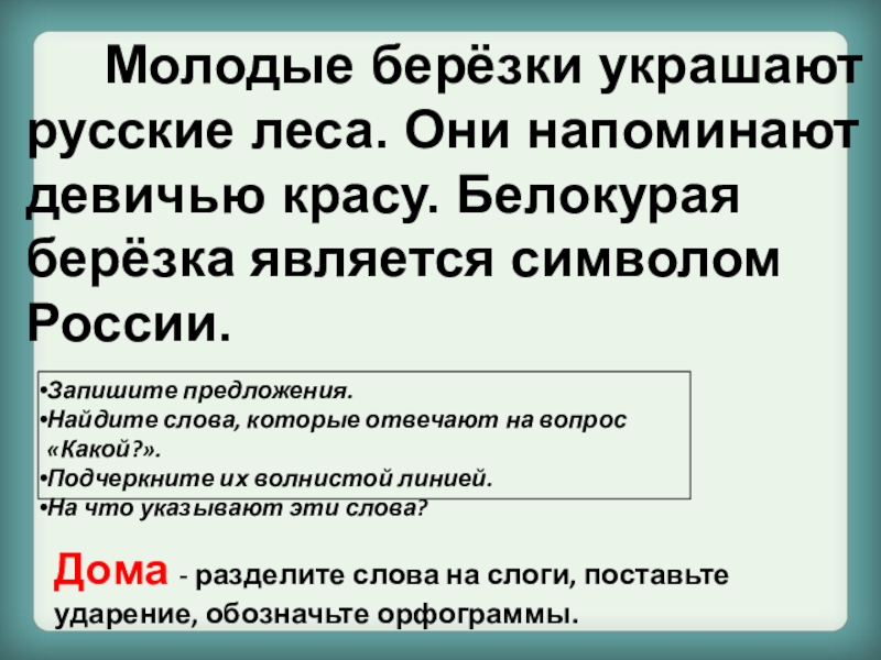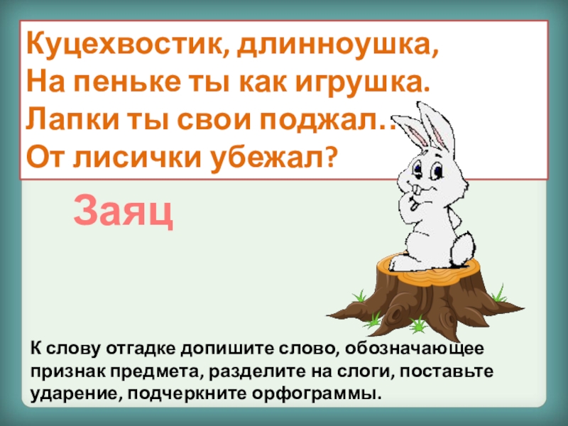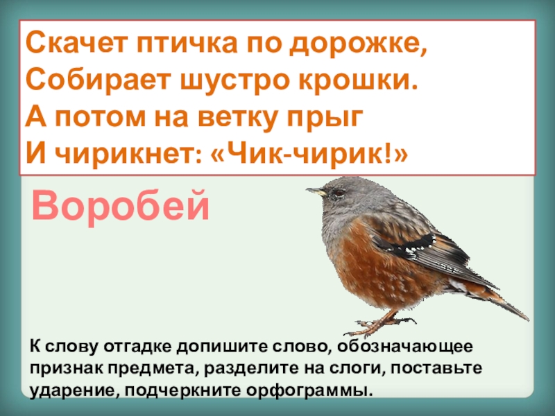 К слову отгадке допишите слово, обозначающее признак предмета, разделите на слоги, поставьте ударение, подчеркните орфограммы.
