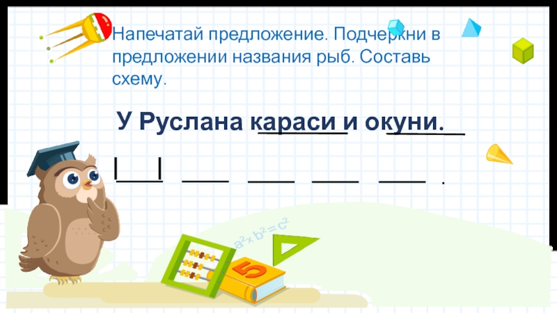 Слайд 4Напечатай предложение. Подчеркни в предложении названия рыб. Составь схему.