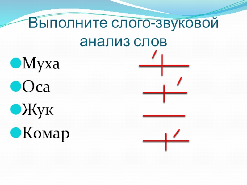 Выполните слого-звуковой анализ словМуха ОсаЖук Комар