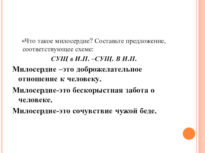 Слайд 8 «Что такое милосердие? Составьте предложение, соответствующее схеме: