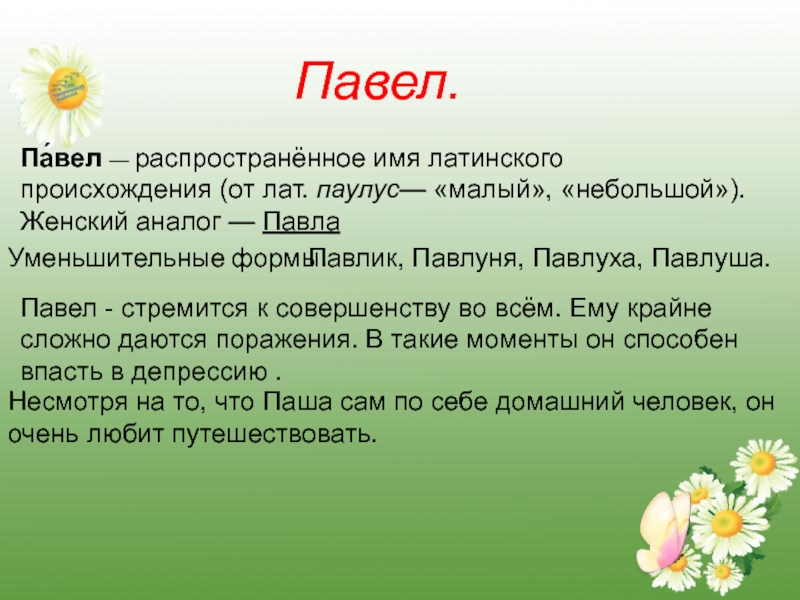Павел - стремится к совершенству во всём. Ему крайне сложно даются поражения. В такие моменты он способен впасть в депрессию .