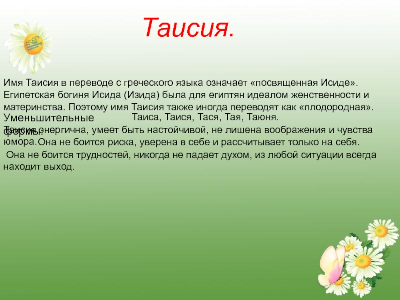 Таисия энергична, умеет быть настойчивой, не лишена воображения и чувства юмора.