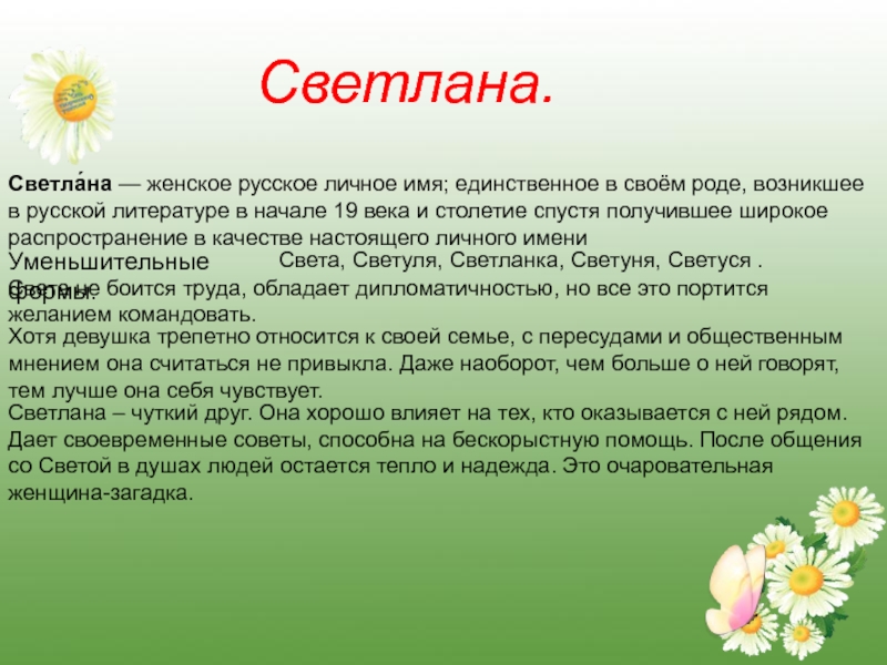 Светлана – чуткий друг. Она хорошо влияет на тех, кто оказывается с ней рядом. Дает своевременные советы, способна на бескорыстную помощь. После общения со Светой в душах людей остается тепло и надежда. Это очаровательная женщина-загадка.