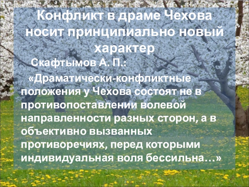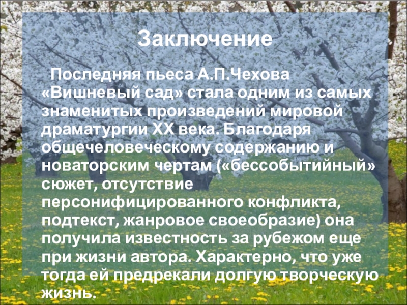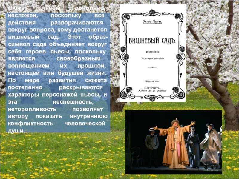 достанется вишневый сад. Этот образ-символ сада объединяет вокруг себя героев пьесы, поскольку является своеобразным воплощением их прошлой, настоящей или будущей жизни. По мере развития сюжета постепенно раскрываются характеры персонажей пьесы, и эта неспешность, неторопливость позволяет автору показать внутреннюю конфликтность человеческой души.