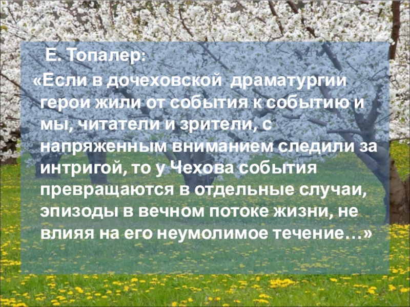 «Чехов открыл в драме новые возможности изображения характера. Он открывается не в борьбе за достижение цели, а в переживании противоречий быта. Пафос действия сменяется пафосом раздумья.