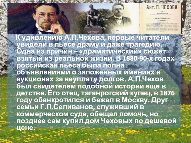 и даже трагедию. Одна из причин – «драматический» сюжет взятый из реальной жизни. В 1880-90-х годах российская пьеса была полна объявлениями о заложенных имениях и аукционах за неуплату долгов. А.П.Чехов был свидетелем подобной истории еще в детстве. Его отец, таганрогский купец, в 1876 году обанкротился и бежал в Москву. Друг семьи Г.П.Селиванов, служивший в коммерческом суде, обещал помочь, но позднее сам купил дом Чеховых по дешевой цене.