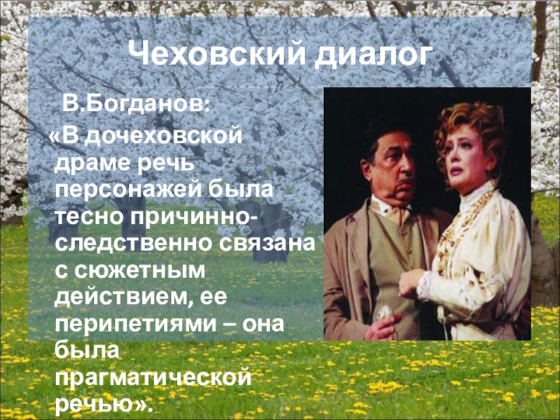 происшествиях. Герои «Вишневого сада» много и заинтересованно говорят о предстоящей продаже имения Раневской и неизбежных изменениях в их личной судьбе. В то же время в прагматических диалогах и монологах, в репликах чеховских героев постоянно возникает и, развиваясь, громко звучит другая речевая стихия, придавая изображенному в сюжете многогранность и многоплановость».
