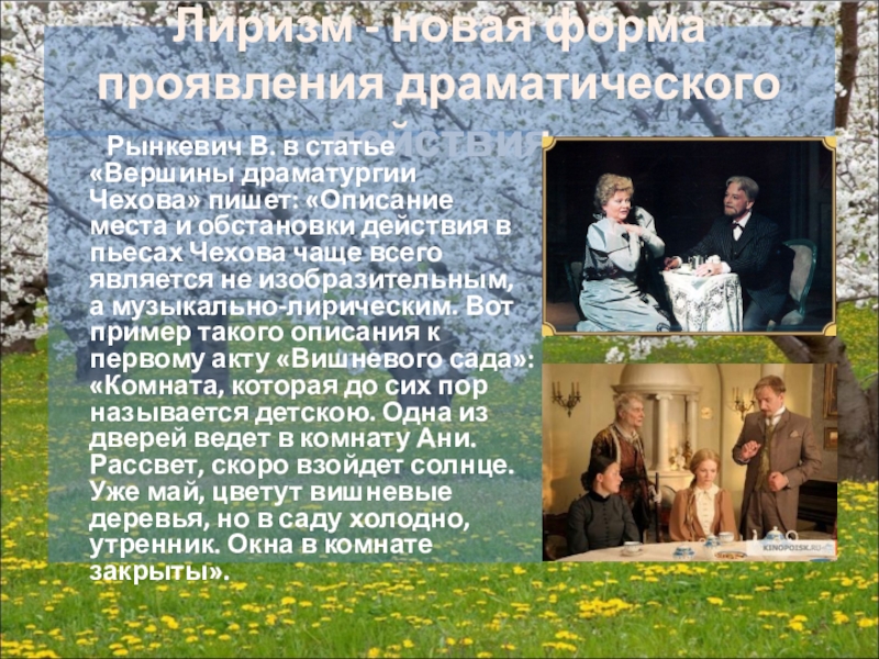 «Вершины драматургии Чехова» пишет: «Описание места и обстановки действия в пьесах Чехова чаще всего является не изобразительным, а музыкально-лирическим. Вот пример такого описания к первому акту «Вишневого сада»: «Комната, которая до сих пор называется детскою. Одна из дверей ведет в комнату Ани. Рассвет, скоро взойдет солнце. Уже май, цветут вишневые деревья, но в саду холодно, утренник. Окна в комнате закрыты».