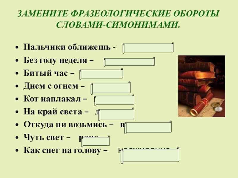 Слайд 3ЗАМЕНИТЕ ФРАЗЕОЛОГИЧЕСКИЕ ОБОРОТЫ СЛОВАМИ-СИМОНИМАМИ.