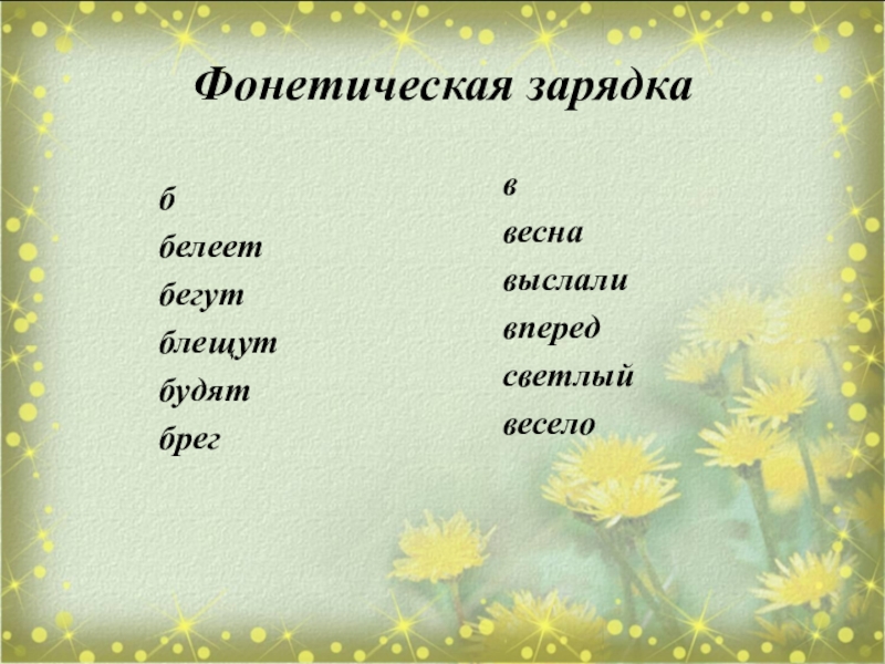 Фонетическая зарядкаббелеетбегутблещутбудятбрегввеснавыслаливпередсветлыйвесело