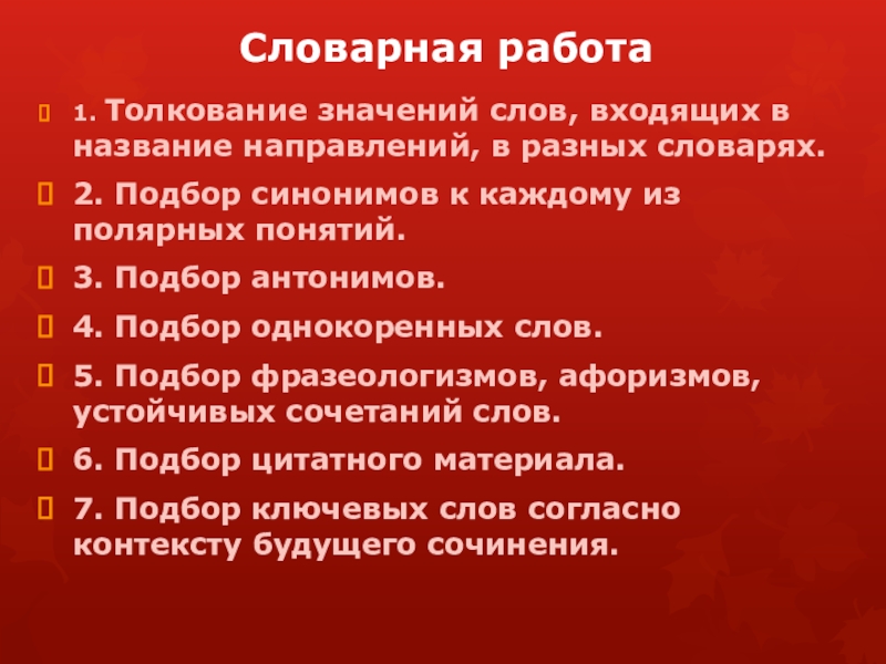 7. Подбор ключевых слов согласно контексту будущего сочинения.